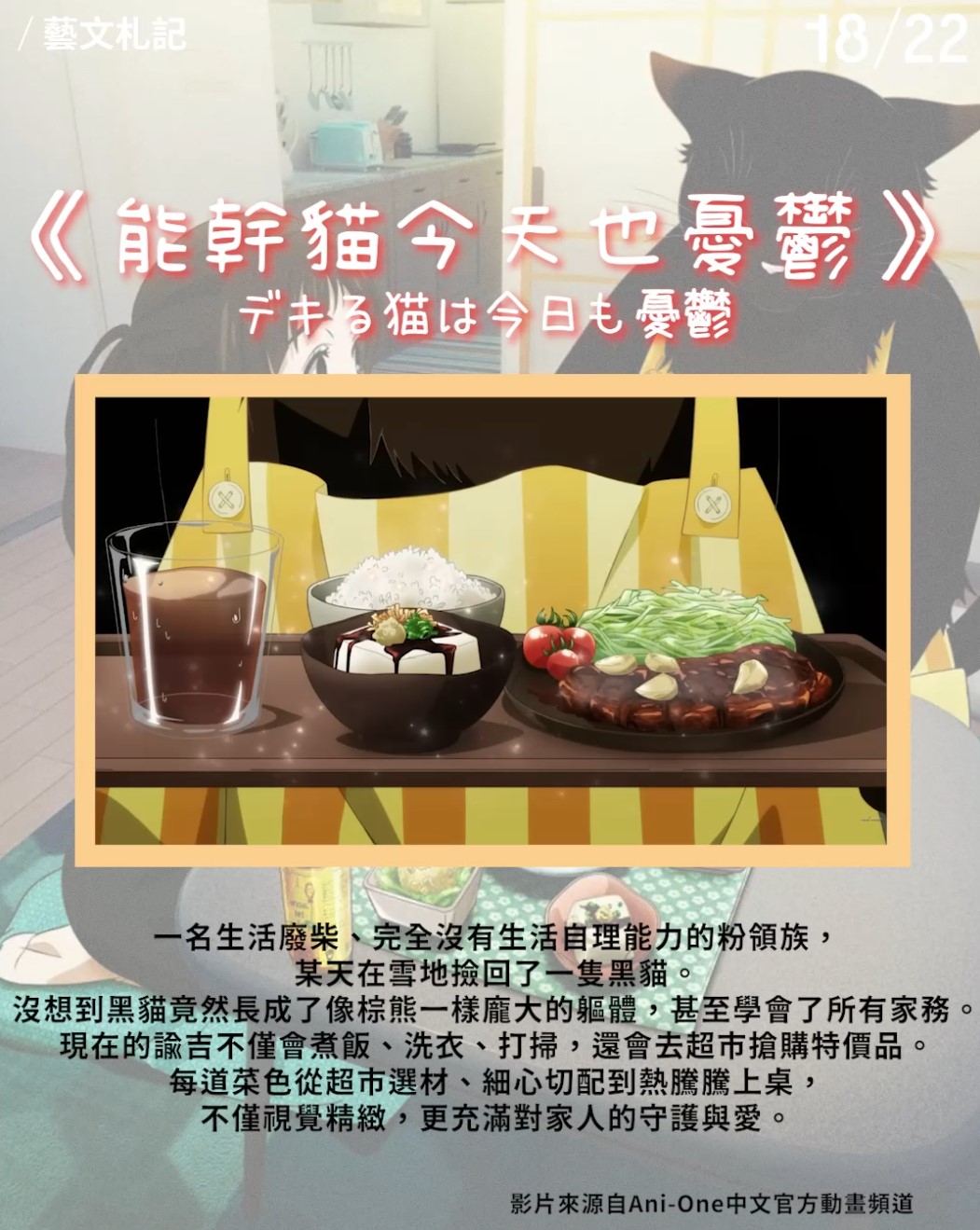 一名生活廢柴、完全沒有生活自理能力的粉領族,某天在雪地撿回了一隻黑貓。沒想到黑貓竟然長成了像棕熊一樣龐大的軀體,甚至學會了所有家務。現在的諭吉不僅會煮飯、洗衣、打掃,還會去超市搶購特價品。每道菜色從超市選材、細心切配到熱騰騰上桌,不僅視覺精緻,更充滿對家人的守護與愛。