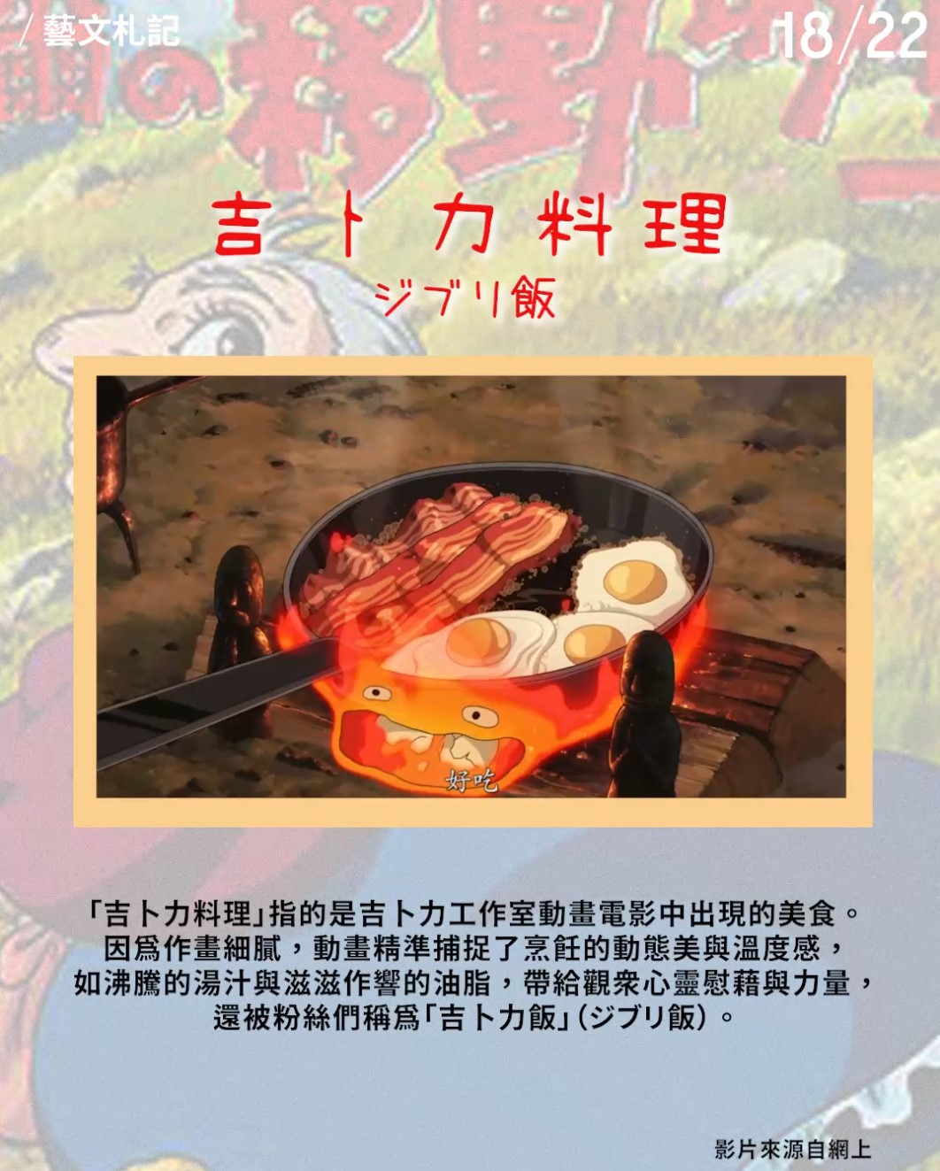 「吉卜力料理」指的是吉卜力工作室動畫電影中出現的美食。因為作畫細膩,動畫精準捕捉了烹飪的動態美與溫度感,如沸騰的湯汁與滋滋作響的油脂,帶給觀眾心靈慰藉與力量,還被粉絲們稱為「吉卜力飯」(ジブリ飯)。